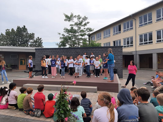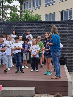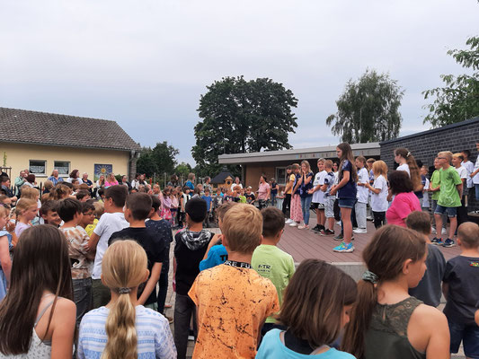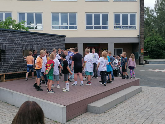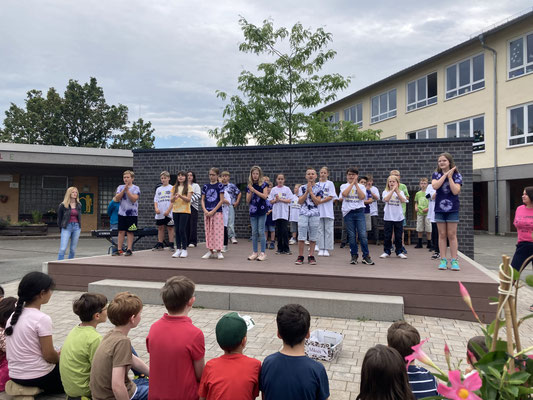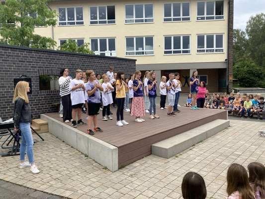 Am Freitag wurden auch unsere Viertklässler verabschiedet. Beide Klassen haben einen Song mit Choreo einstudiert und auf der Bühne vorgetragen. Die Schulgemeinde wiederum verabschiedete die
