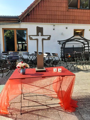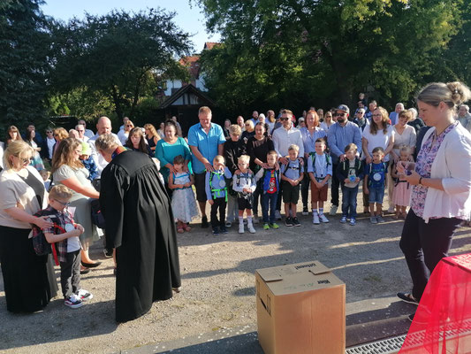 Die Feier begann mit einer Andacht mit Pfarrerin Vöcking. Mit einem Umzugskarton verdeutlichte sie den Kindern, dass der Übergang in die Schule auch eine Art Umzug ist, vom Kindergarten in die
