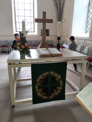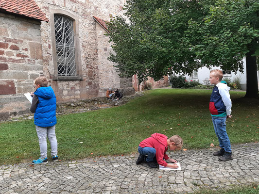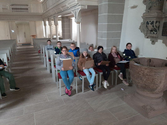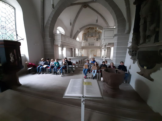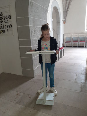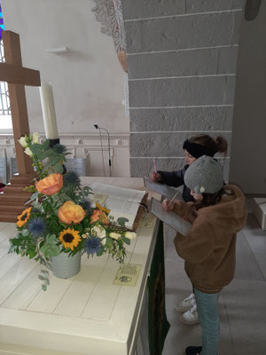 Dazu gab es Wissenskärtchen zu den einzelnen Dingen (z.B. Altar, Kanzel, Bänke, Gesangbücher u.v.m.) und eine Kirchenrallye, bei der verschiedene Fragen zu beantworten waren.