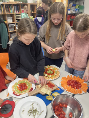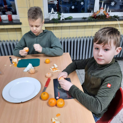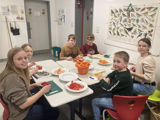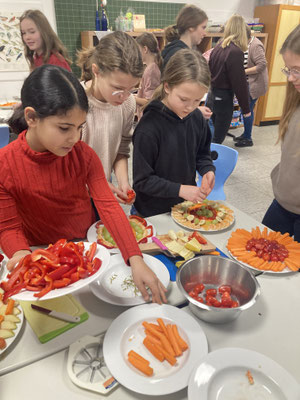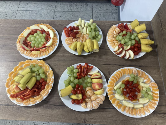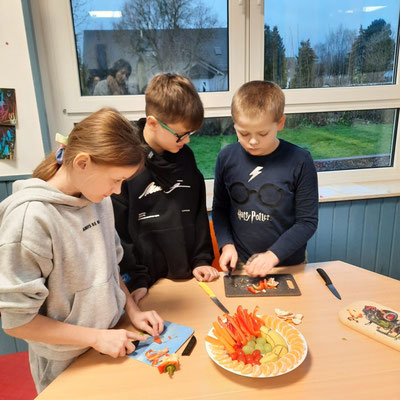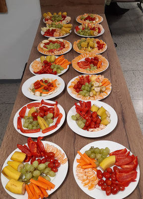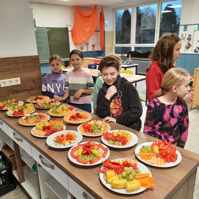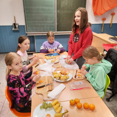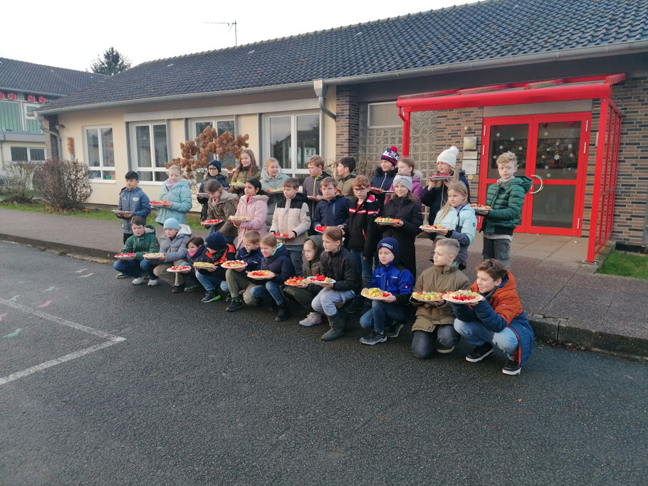 Die Kinder der 4. Klassen, einige Eltern und Kolleginnen haben am Freitagmorgen fleißig Obst und Gemüse geschnippelt, um dieses in der großen Pause auf dem Schulhof an die Schülerinnen und Schüler zu verteilen. Die Teller waren ziemlich schnell geleert. Mundgerecht zubereitet greifen dann doch alle Kinder gerne zu. Zur Weihnachtszeit ist das Obst und Gemüse für einige Kinder ein Kontrastprogramm zu den Süßigkeiten, die in dieser Zeit vielleicht hier und da Vorrang haben.