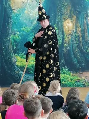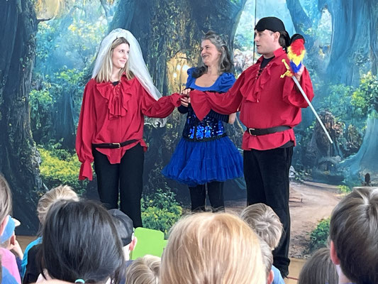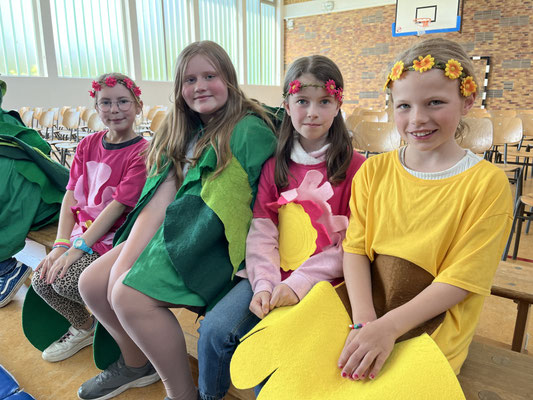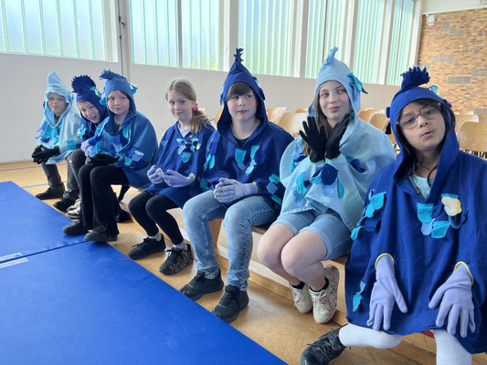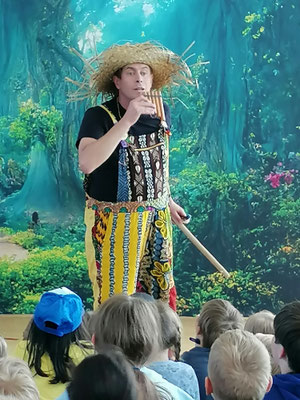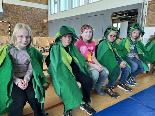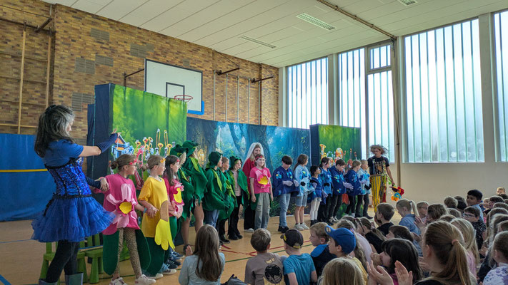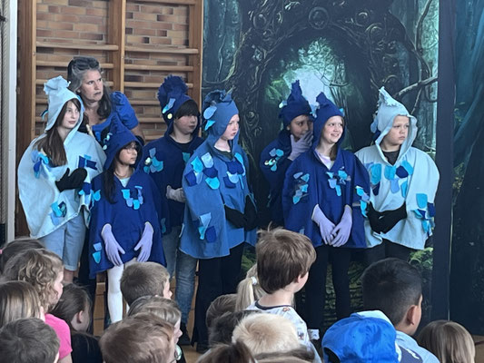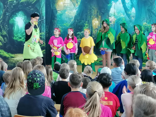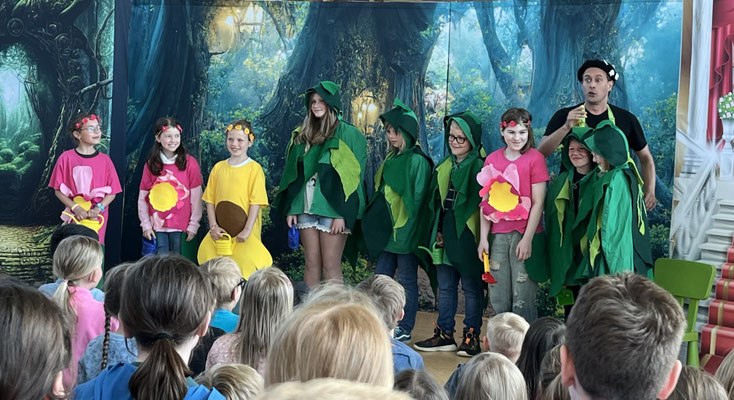 Einige unserer Kinder durften im Stück mitspielen und wurden in einer nur 20-minütigen Probe in die Handlung integriert. Mehrfach sangen die Kinder den Refrain des Titelliedes mit, der in den Musikstunden vorbereitet und eingeübt wurde.