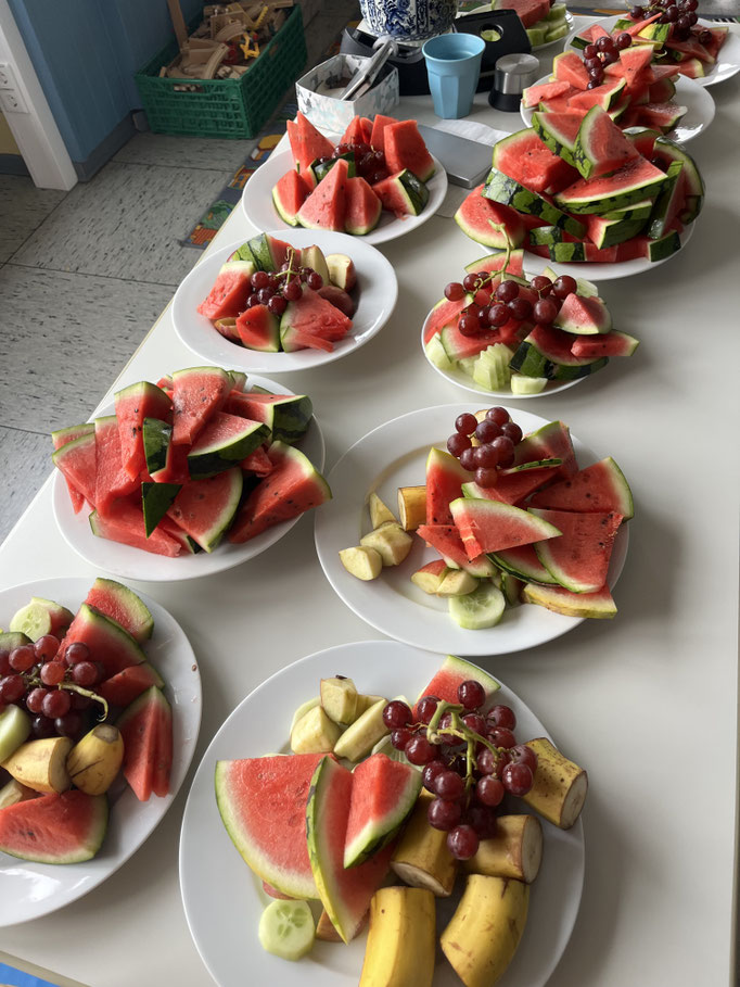 Gemeinsam wurden Wassermelonen, Trauben, Bananen, Äpfel und Gurken gewaschen und geschnitten. Die Kinder halfen mit großer Begeisterung beim Zubereiten. Aus dem bunten Obst entstanden viele