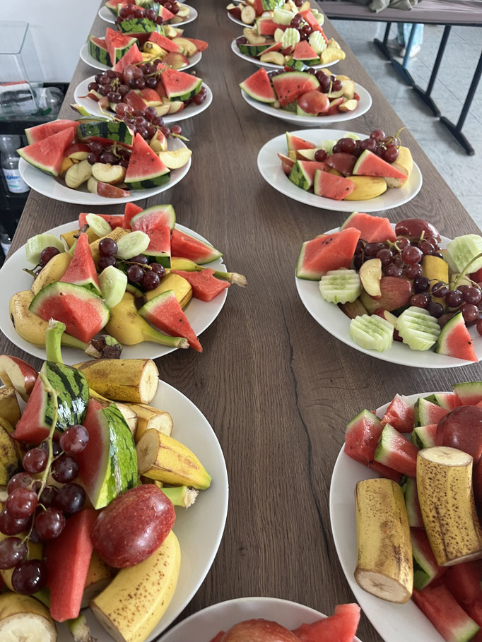 leckere Obstteller. In der großen Pause wurden diese an die ganze Schule verteilt. Besonders beliebt waren die saftigen Melonenstücke und die knackigen Weintrauben. Die fruchtige Erfrischung kam