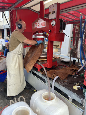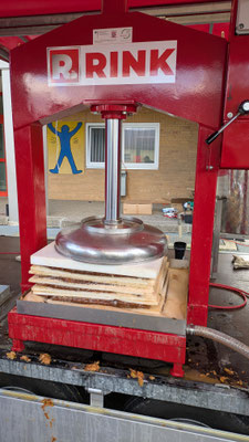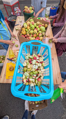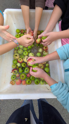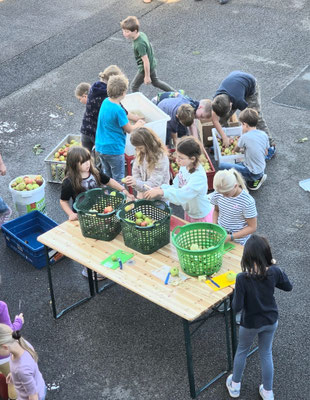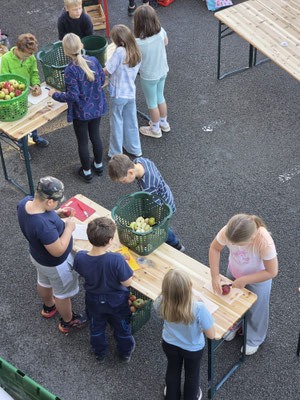 Früh am Morgen rollte dann Herr Danowsky aus Wettesingen mit seiner großen Obstpresse an. Als er die vielen Körbe voller Äpfel sah, war er sichtlich überrascht. Danach packten alle Klassen kräftig mit an: Zuerst wurden die Früchte gründlich gewaschen, dann sortierten die Kinder die schlechten Stücke aus, bevor die Äpfel in die Maschine kamen. Mit großen Augen schauten sie zu, wie sich die Äpfel in frischen Saft verwandelten – und natürlich durfte dieser gleich probiert werden. Der Geschmack war intensiv, leicht säuerlich und dadurch etwas ganz Besonderes. Am Ende hieß es dann noch: putzen, aufräumen und alles ordentlich zurücklassen.