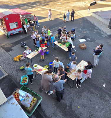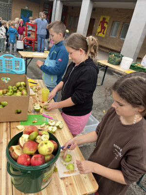 Am 5. September verwandelte sich die Schule in eine kleine Saftfabrik. Schon Tage vorher hatten Kinder zusammen mit ihren Eltern unzählige Äpfel gesammelt und in die Schule gebracht. Die zweiten Klassen hatten im Bereich „Osterplatz“ Breuna einige Äpfel gepflückt und mit Hilfe des Hausmeistermobils zur Schule transportiert.